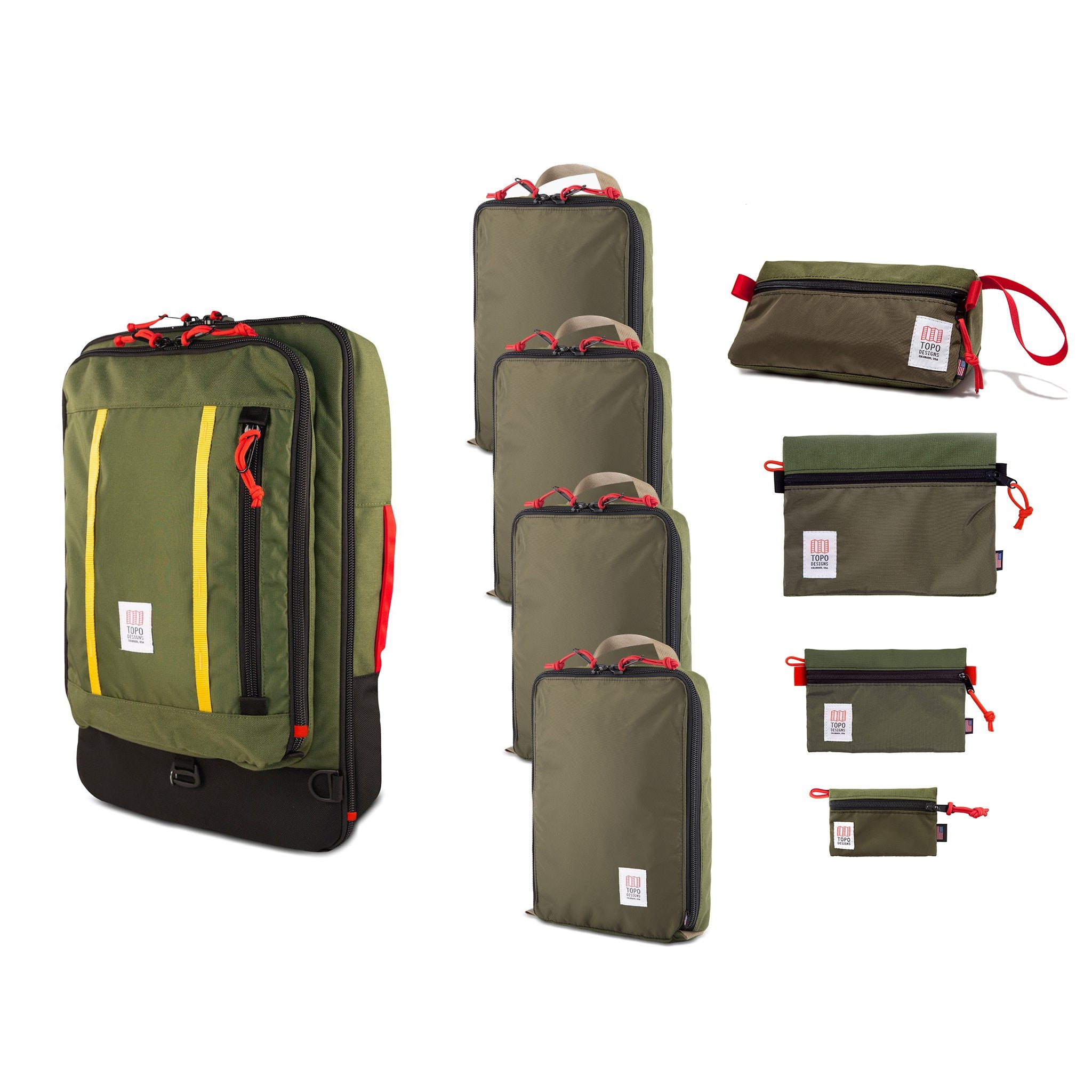 The Complete Travel Bag Kit – 40L includes everything you need to maximize space and optimize your bag during travel: a carry-on friendly 40L Travel Bag, 4 space-saving Pack Bags for keeping your luggage organized, our signature triangular Dopp Kit, a Micro Accessory Bag for holding headphones or cash, a Small Accessory Bag for your phone charger and keys and a Medium Accessory Bag for larger charging cables.