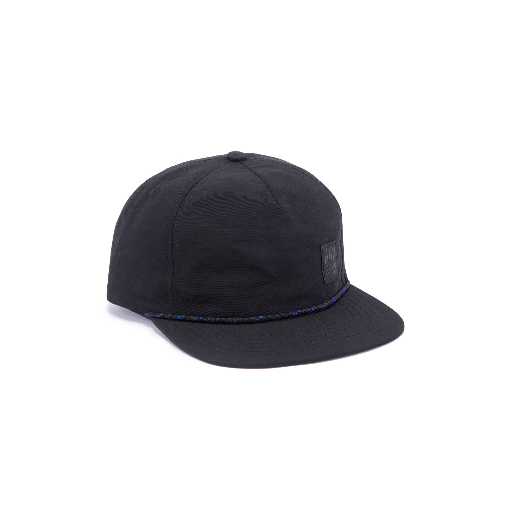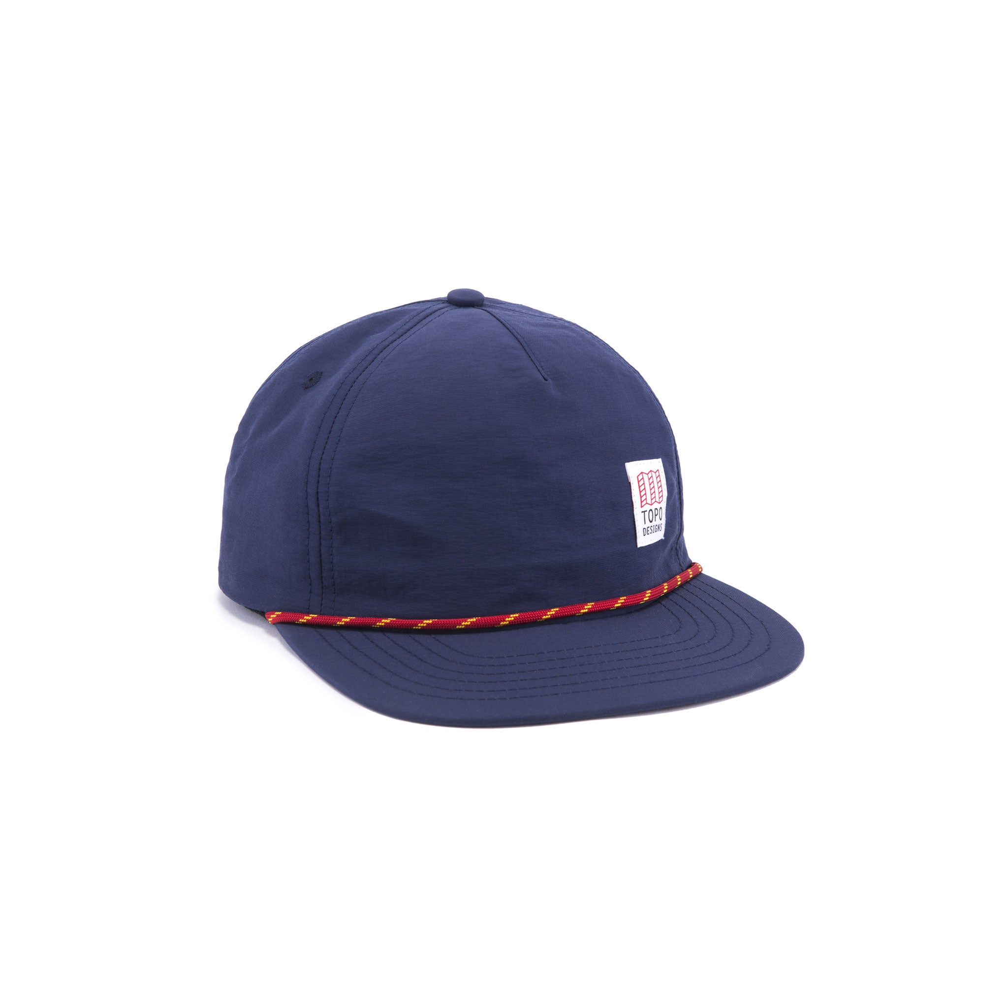 This 5-panel hat features a small Topo Designs label off-center and multicolor paracord trim at the visor.