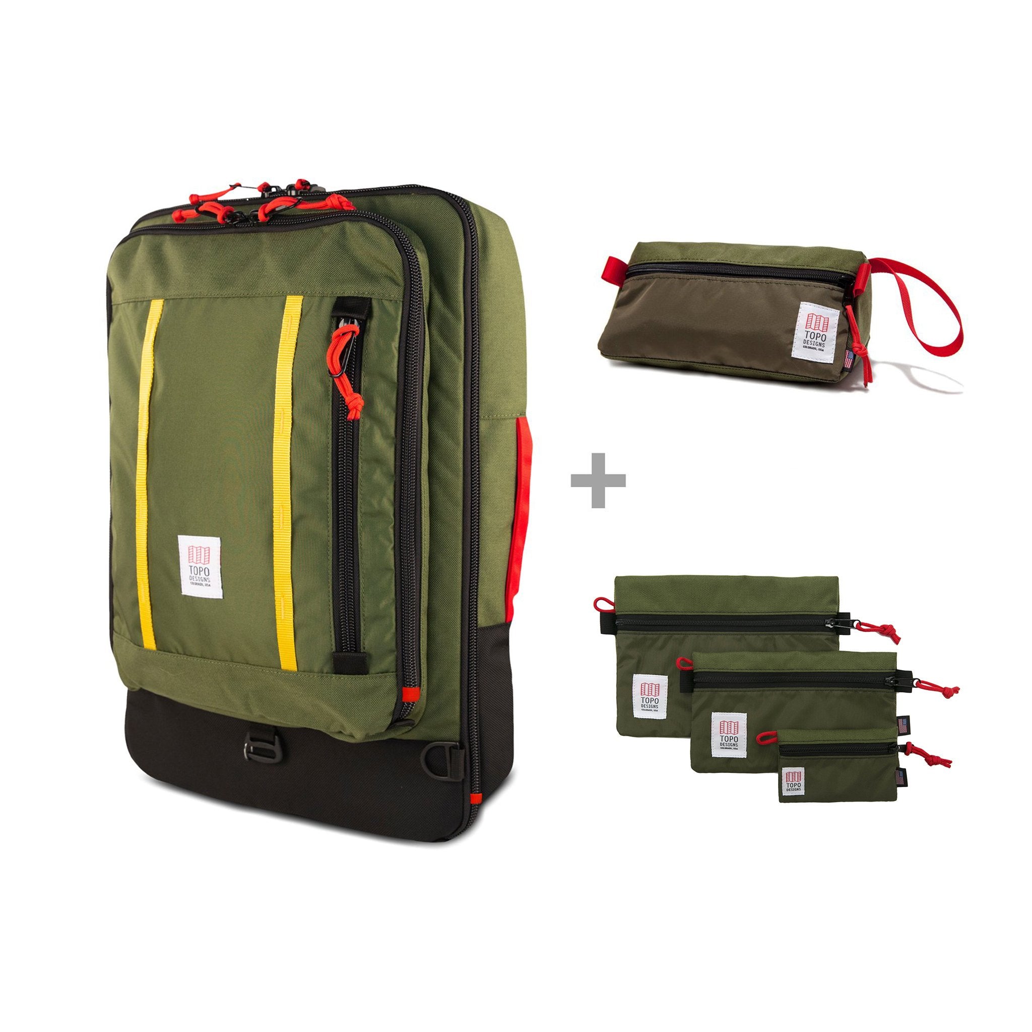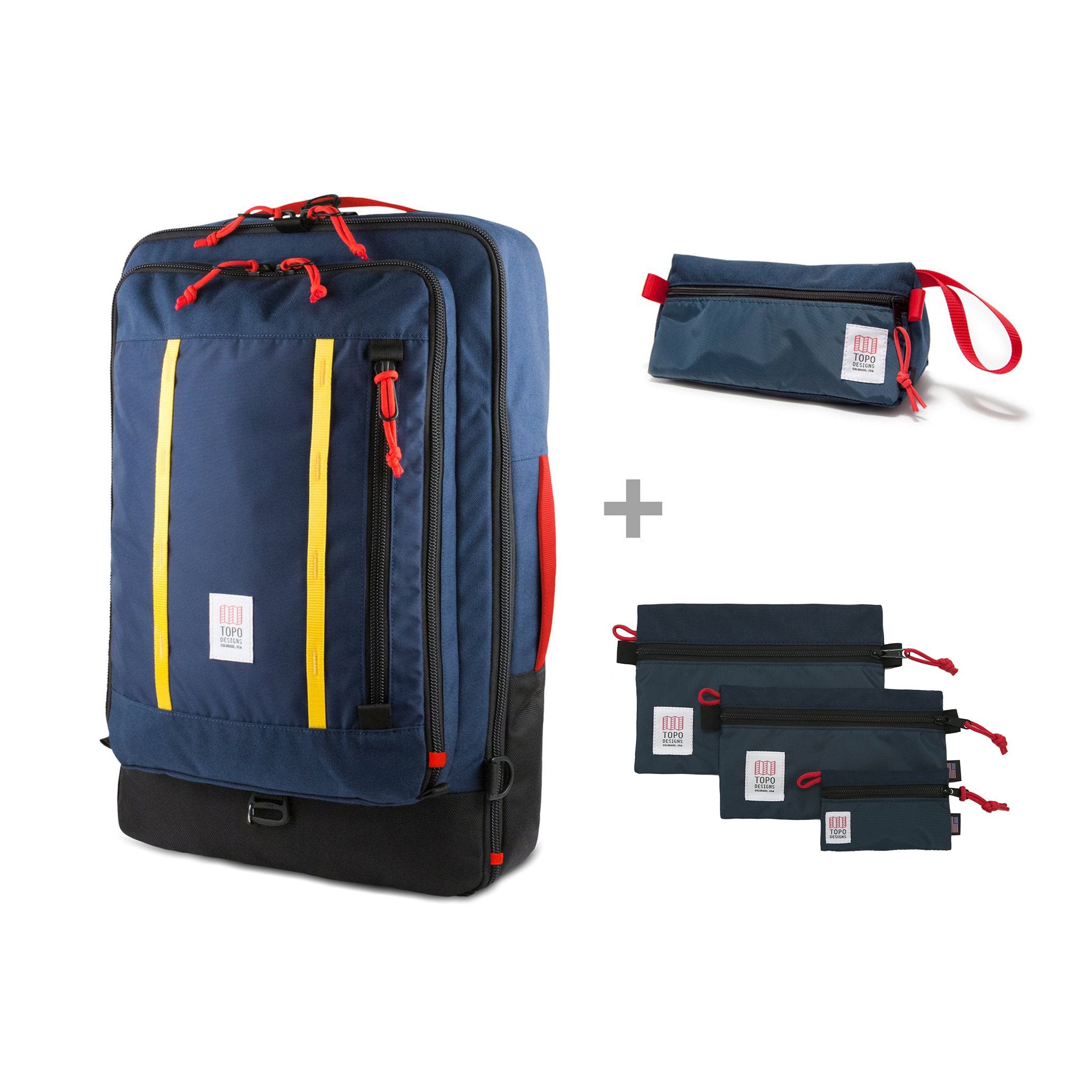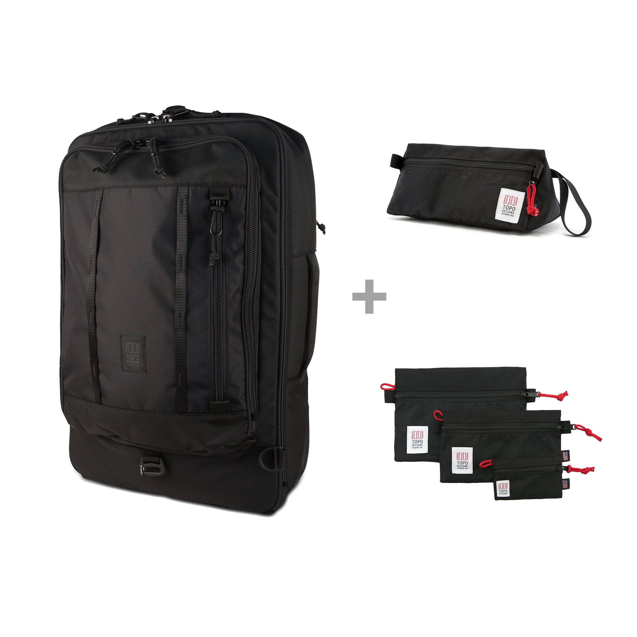 The Escape Travel Bag Kit - 40L includes our Travel Bag - 40L, our bestselling Dopp Kit to hold toiletries and three Accessory Bags: Micro, for holding headphones or cash, Small for holding small charging cables and keys, and Medium for keeping larger cables and cords organized. Buying as a kit saves you $35.