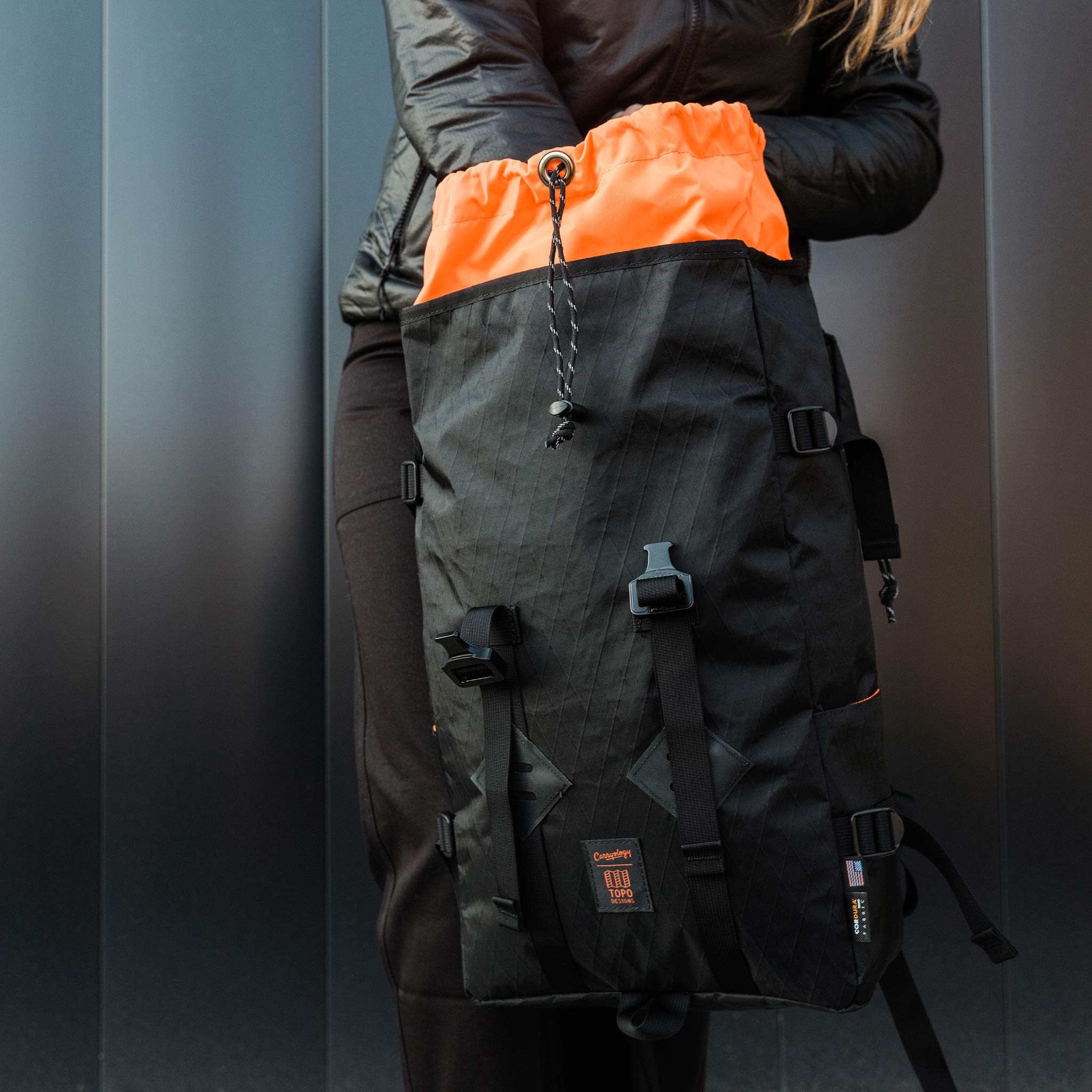We are excited to say that we landed exactly where we'd hoped to be in hardware, fabrics and performance. Our joint answer to the perfect carry started with the classic Topo Designs Klettersack as our canvas, an obvious choice in function and form. We added top of the line X-Pac™ fabric, AustriAlpin Cobra buckles and a vibrant hi-vis orange nylon liner because we wanted to develop the pack of our dreams.