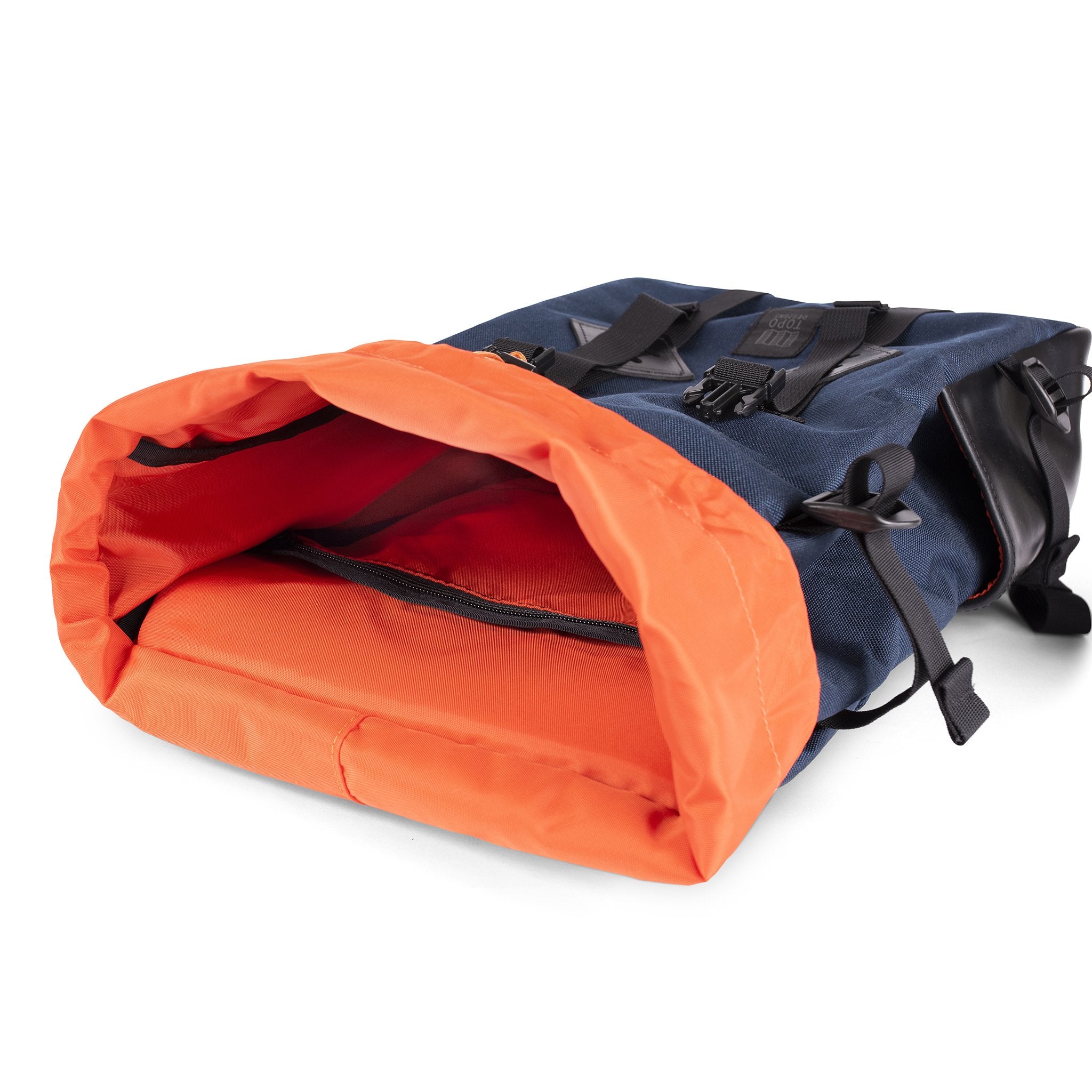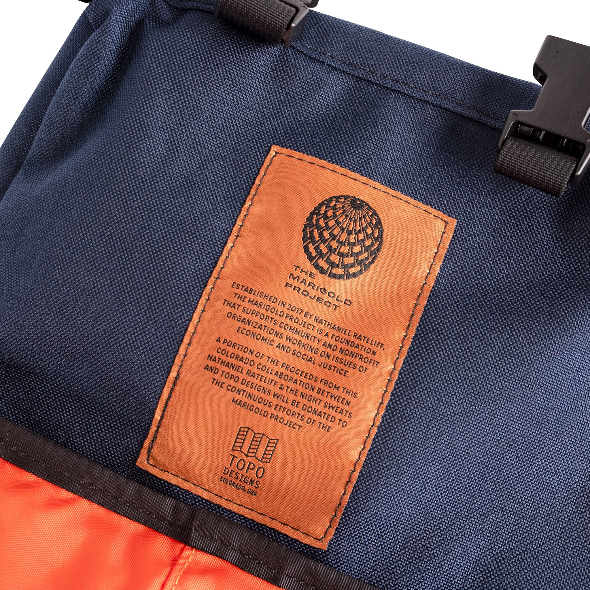 The Topo Designs x Nathaniel Rateliff & The Night Sweats Klettersack is built from navy 1000D Cordura® and black Horween® leather, then finished with a woven Marigold Project label.