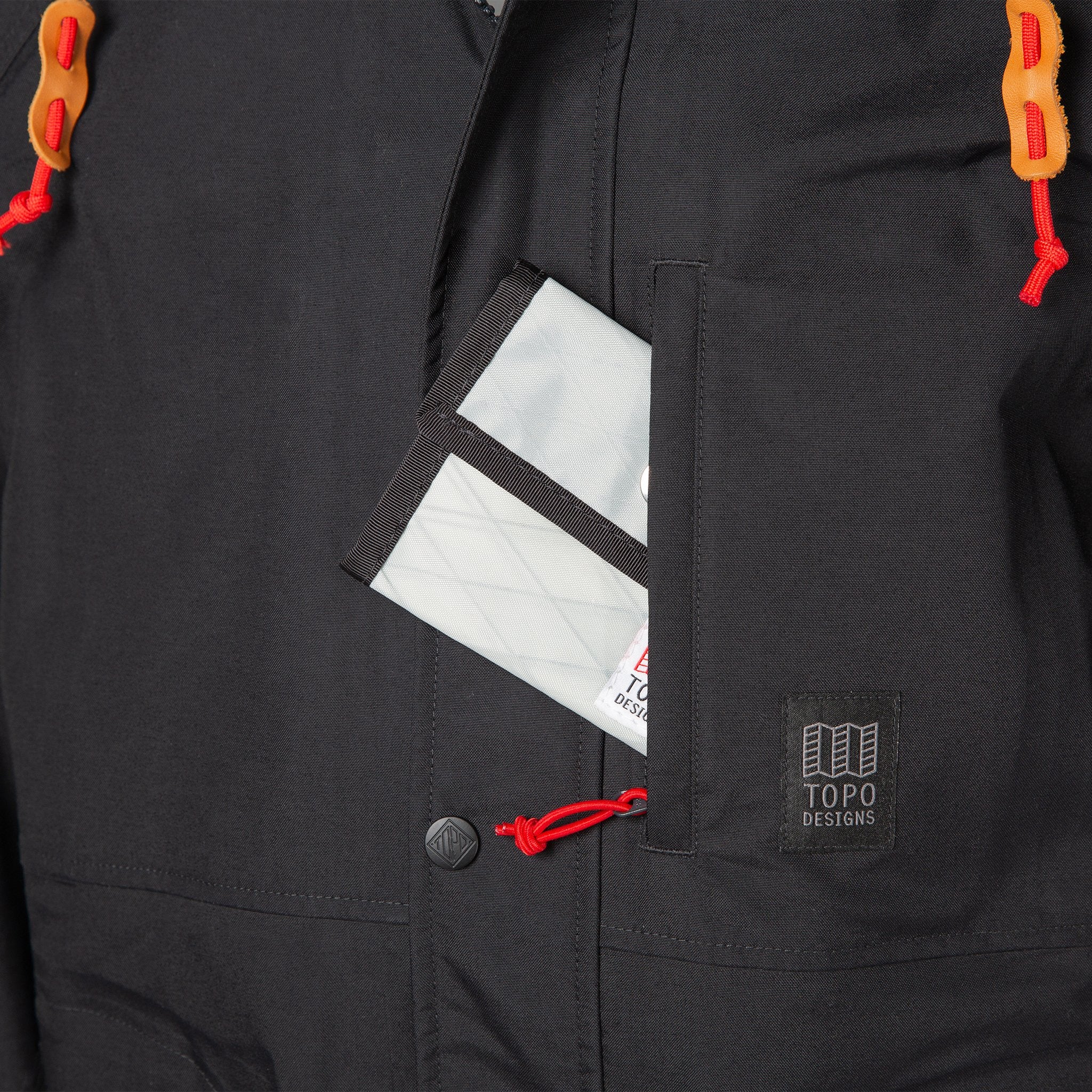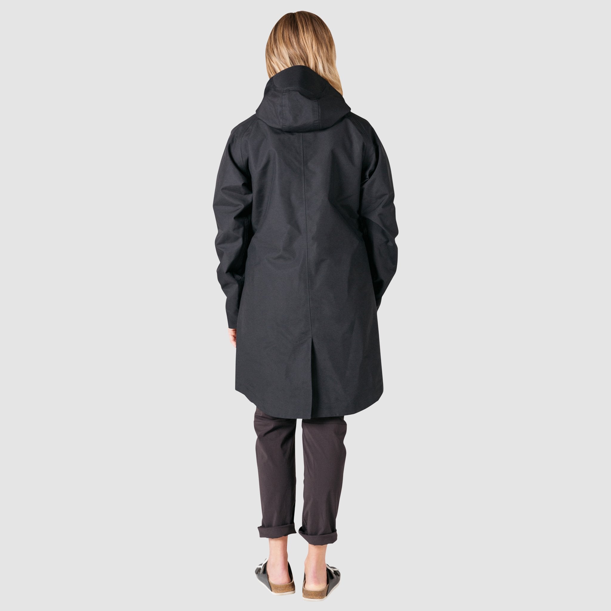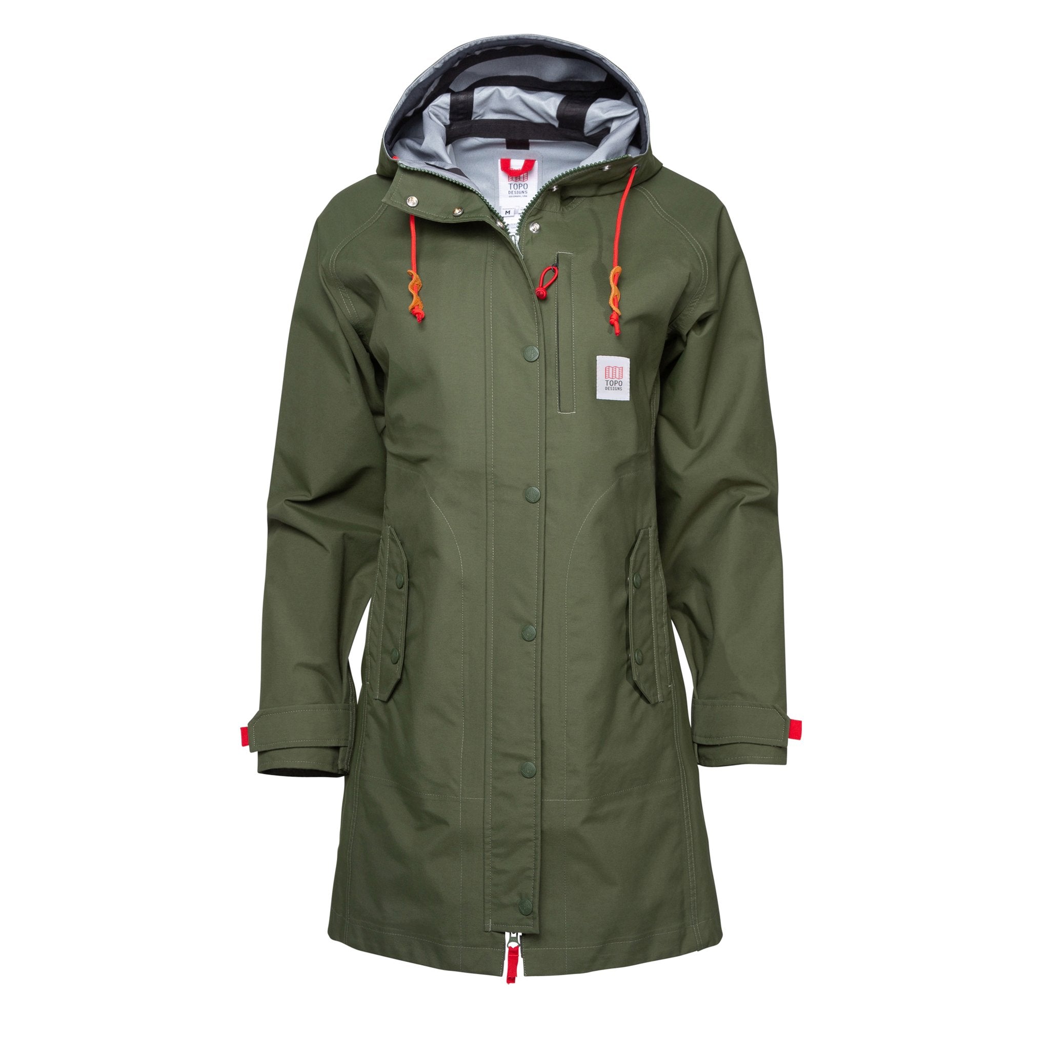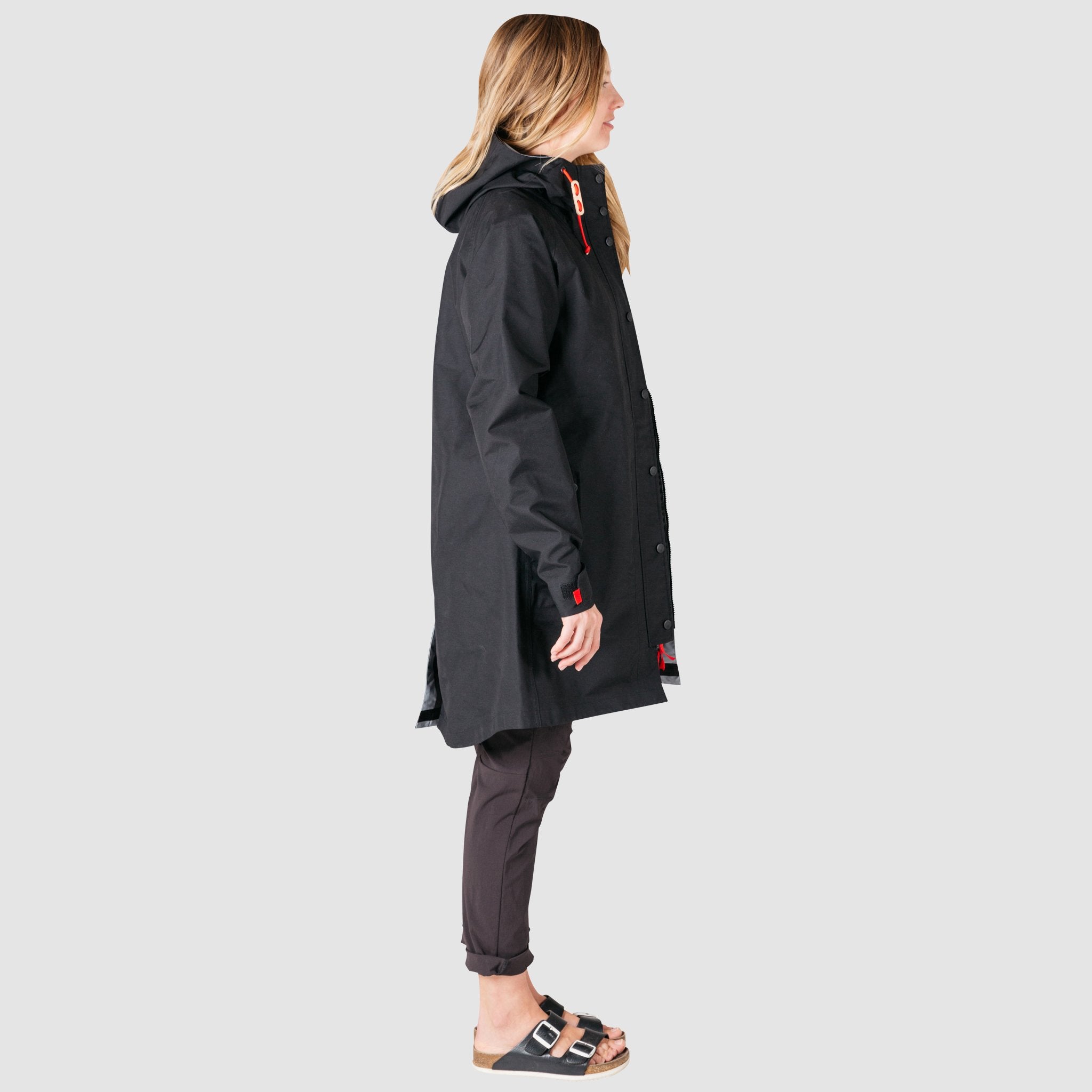 A long silhouette with 3-layer oxford construction and fully-taped seams, with a 10K Waterproof Rating. A structured visor hood with natural leather toggles keeps the hood up and out of your eyes. Multiple hand pockets and a chest pocket keep keys, phone or wallet secure.